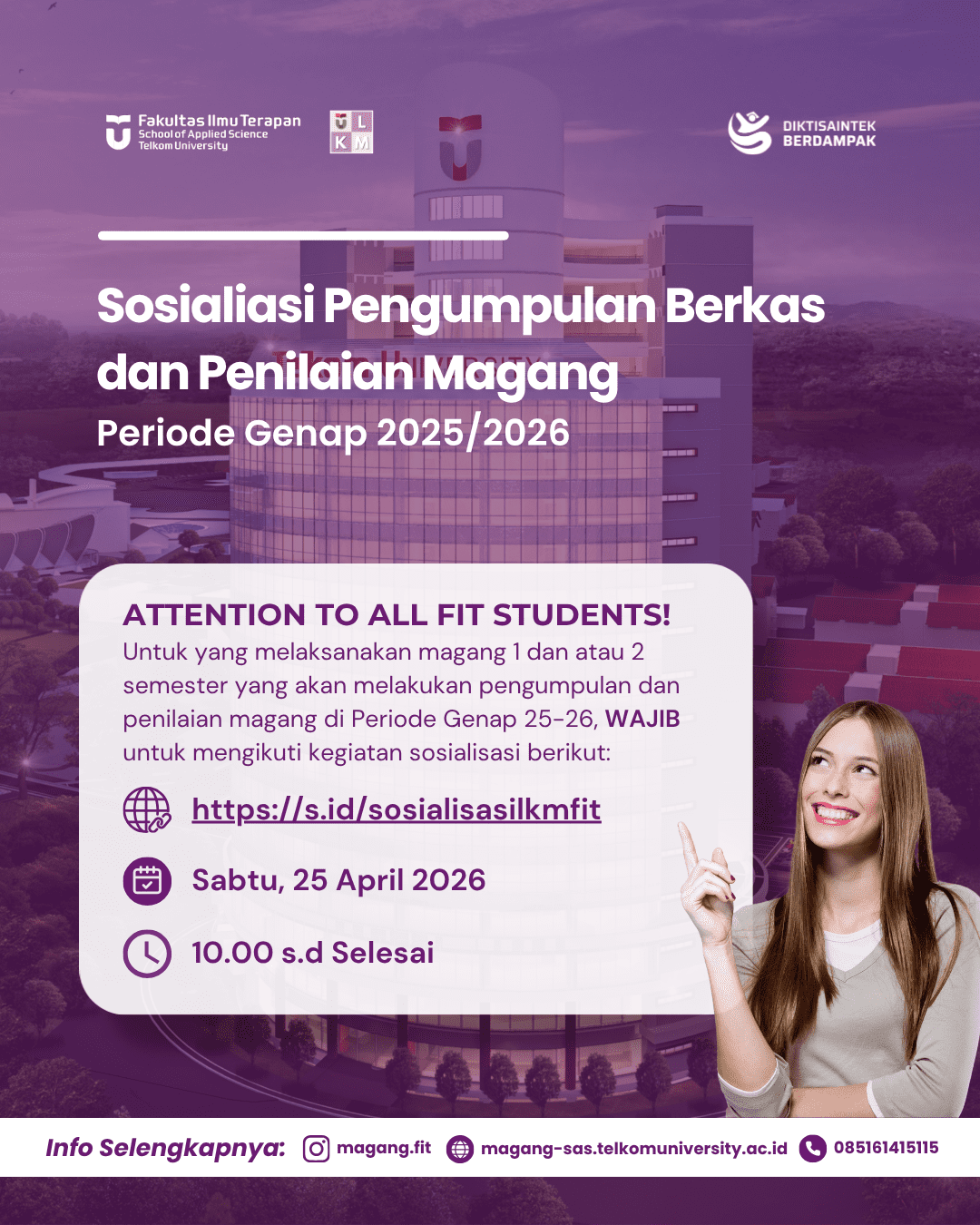 Untuk mahasiswa yang melaksanakan magang 1 dan/atau 2 semester yang akan melakukan pengumpulan dan penilaian magang di Periode Genap 25-26, WAJIB untuk mengikuti kegiatan sosialisasi ini. Daftarkan diri melalui link di atas.