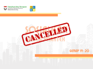 Dikarenakan adanya surat edaran dari Rektor Telkom University mengenai penyebaran covid-19, maka beberapa acara yang mengundang massa dalam jumlah banyak harus dibatasi, termasuk sosialisasi KP yang diestimasikan akan lebih dari 500 mahasiswa datang. Kami ucapkan permohonan maaf sebesar-besarnya atas dibatalkannya Sosialisasi Kerja Praktek yang seharusnya dilaksanakan 13 Maret 2020.